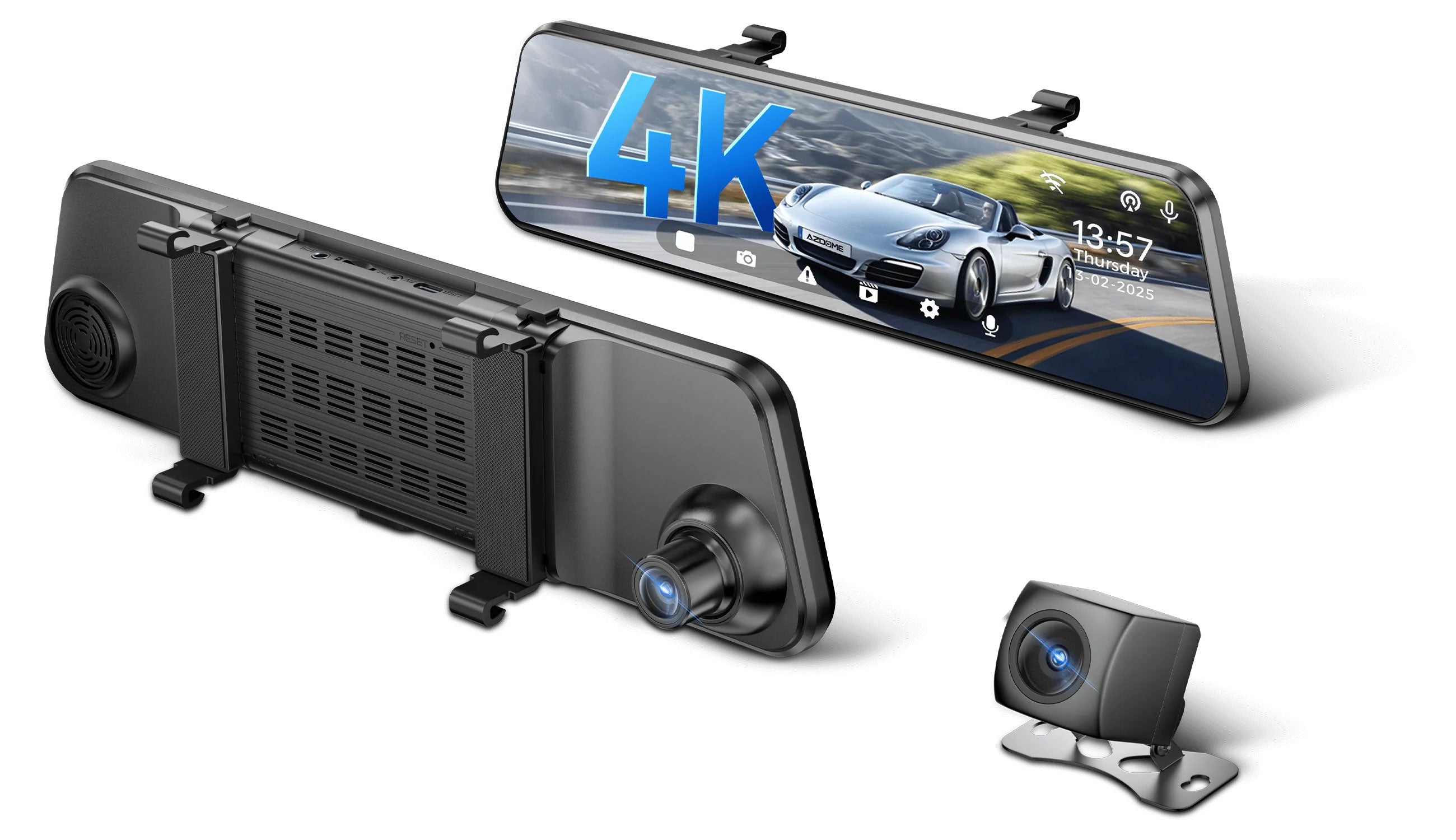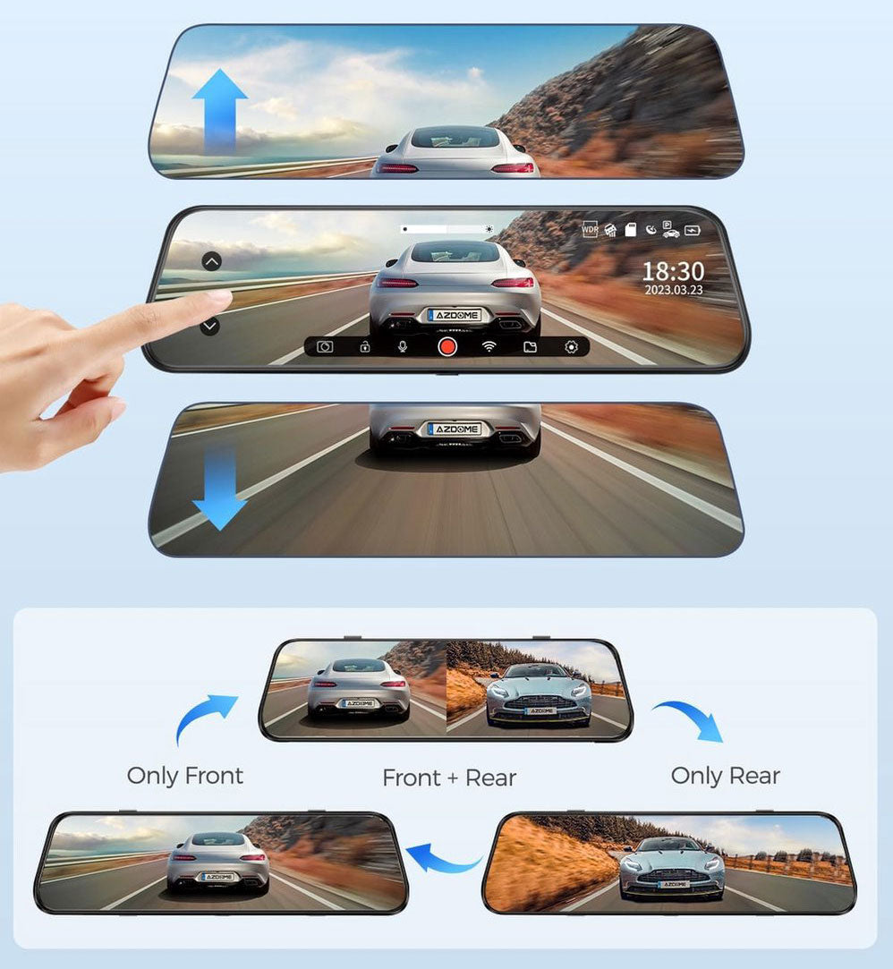 La AZDome PG17 Pro Wifi es una dashcam de 2 canales con un diseño único que se puede colocar sobre cualquier espejo retrovisor interior con las abrazaderas de goma incluidas. Gracias a su gran pantalla LCD táctil de 12 pulgadas, se convierte en un espejo retrovisor digital de alta calidad. La cámara trasera se muestra de forma completa y muy nítida en la gran pantalla y con un solo «deslizamiento» en la pantalla se puede cambiar entre la cámara delantera y la trasera.