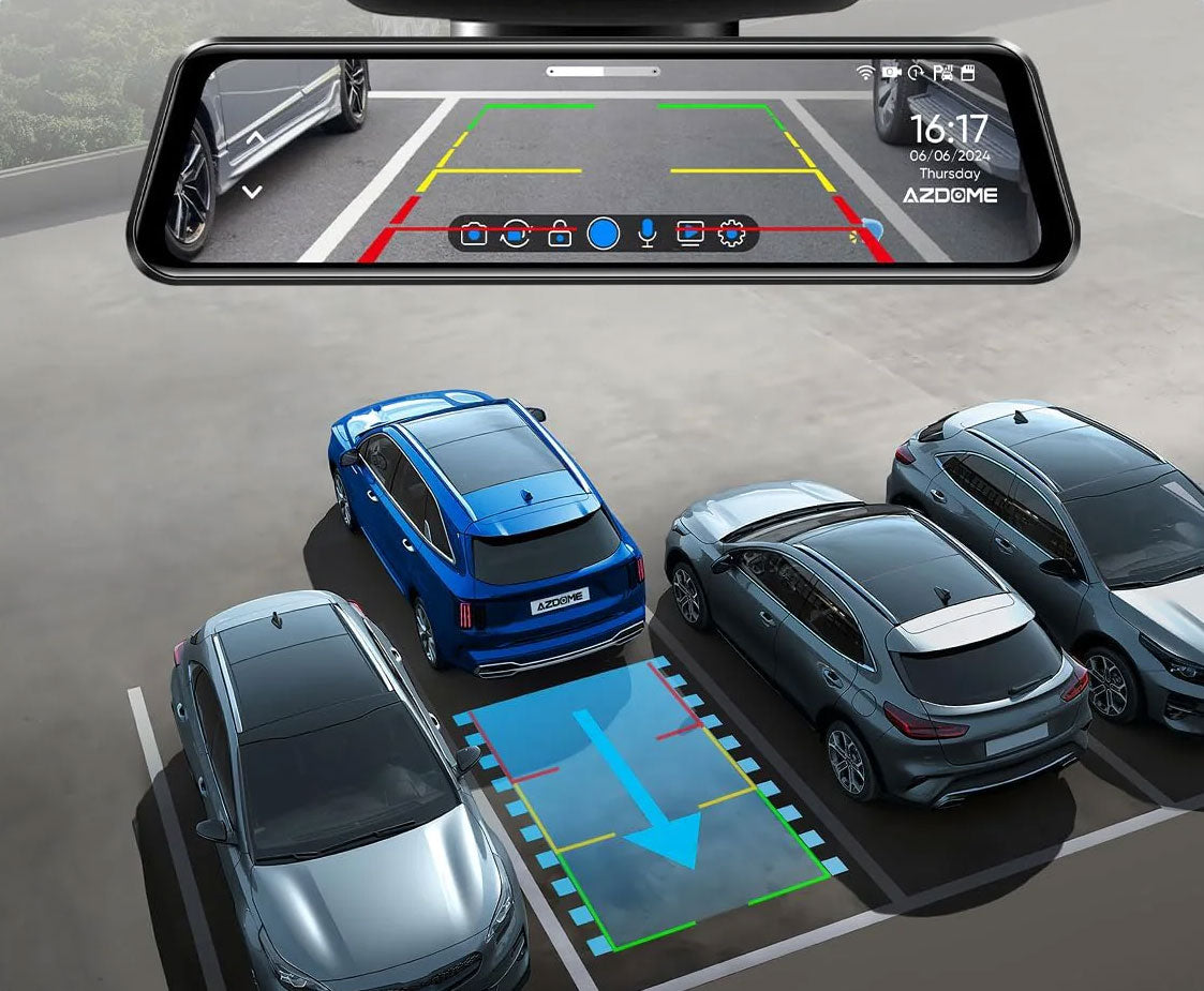 Gracias a su práctico diseño y a su cámara trasera, la AZDome PG17 Pro Wifi también es ideal para utilizarla como ayuda al aparcar. La cámara trasera se suministra con un cable adicional en la fuente de alimentación que se puede conectar a la fuente de alimentación de la luz de marcha atrás. Cuando el coche se pone en marcha atrás, la cámara trasera se muestra automáticamente en pantalla junto con los indicadores de ayuda al aparcar.