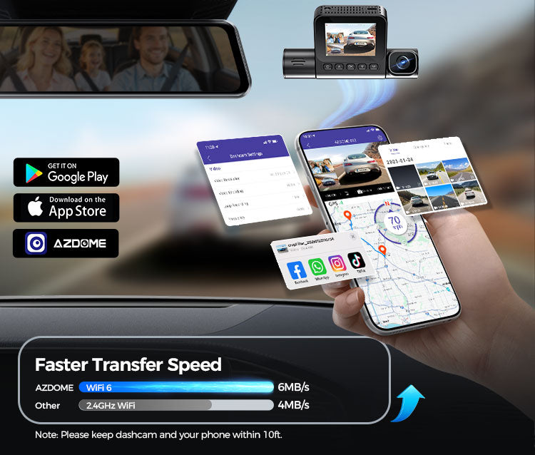 La AZDome S58 4G está equipada con wifi, lo que permite ver fácilmente todas las imágenes a través del smartphone. El wifi tiene un alcance de unos 10 metros. La aplicación AZDome está disponible para teléfonos y tabletas iOS (Apple) y Android. A través de la aplicación se pueden ver y descargar las imágenes, por lo que ya no es necesario sacar la tarjeta SD de la cámara.