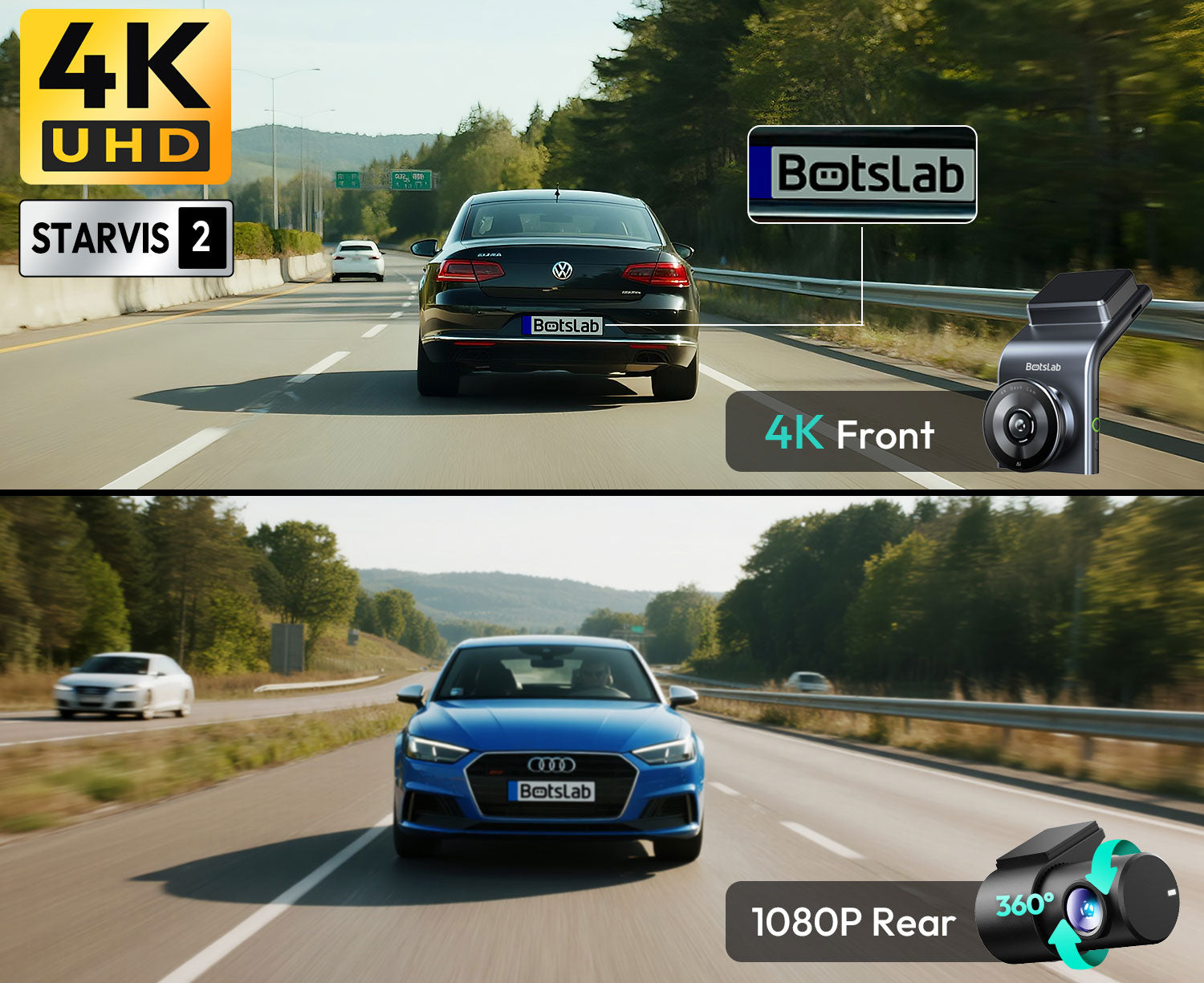 La Botslab G300H Plus utiliza un renovado sensor de imagen Sony STARVIS 2 en la parte delantera. Este avanzado sensor proporciona imágenes excepcionalmente nítidas y contrastadas, especialmente con poca luz. La cámara delantera graba en resolución Ultra HD 4K, mientras que la cámara trasera graba en FullHD.