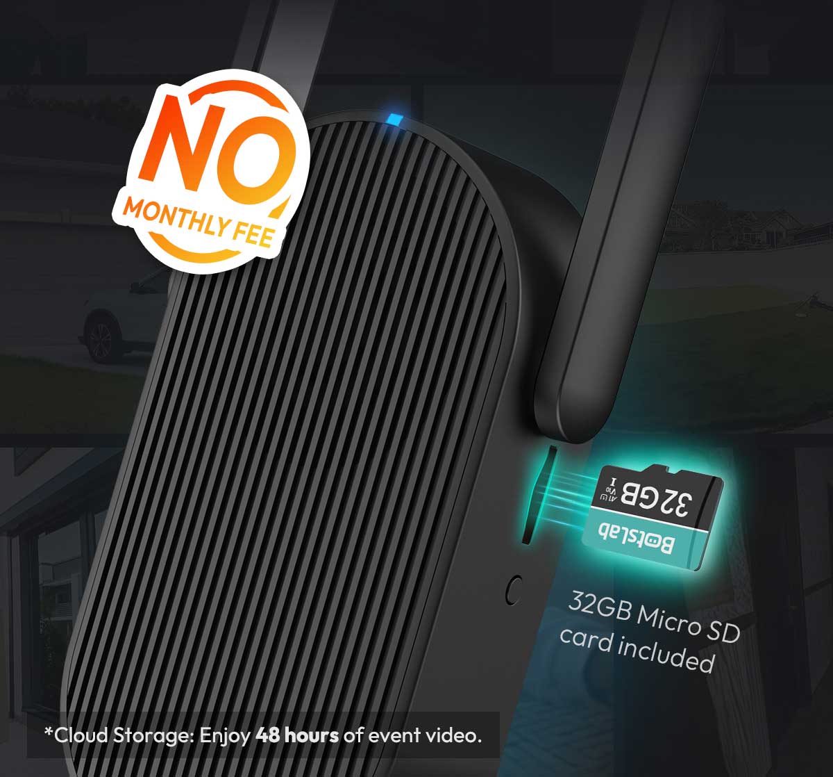 El Botslab R810 admite tarjetas Micro SD de hasta 256 GB para almacenamiento local (32 GB incluidos). Además, obtienes acceso gratuito al almacenamiento en la cloud de Botslab, donde se guardan las imágenes de vídeo hasta 48 horas.