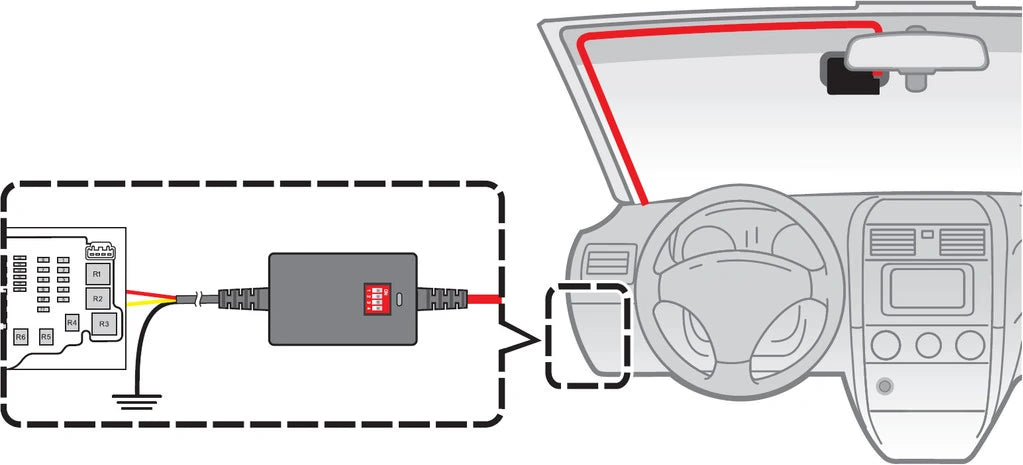 De voeding heeft een ingebouwde schakelaar die ervoor zorgt dat de accu van je auto niet leeg raakt wanneer de dashcam aan het filmen is. Je hoeft dus niet bang te zijn dat je met een lege accu komt te staan. De schakelaar is instelbaar op verschillende voltages van 11,4V tot 12,3V. Afhankelijk van het type auto en het benodigde voltage om te kunnen starten kun je het voltage hoger of lager instellen.