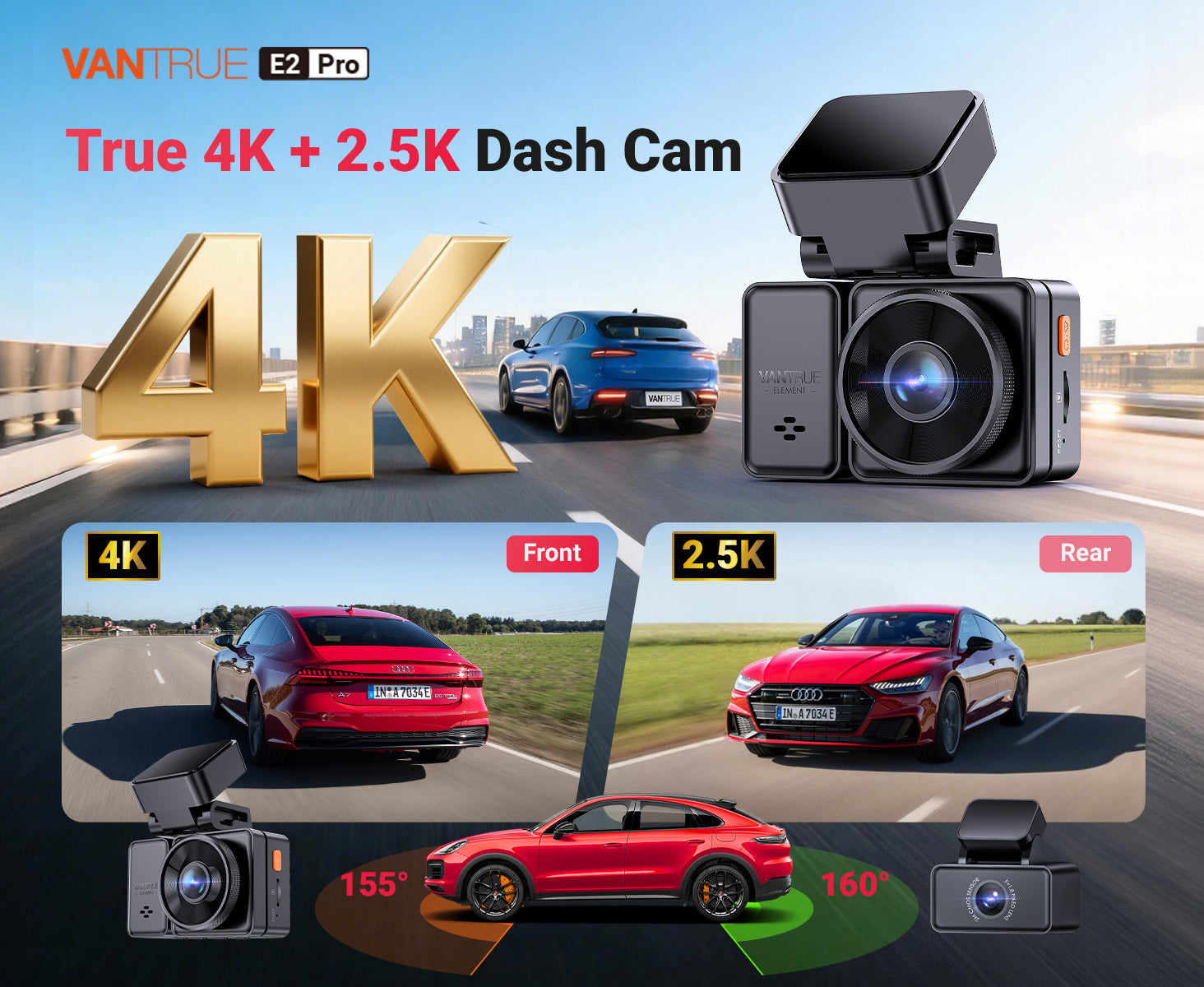 La Vantrue E2 Pro es una dashcam 4K de alta calidad con una cámara trasera 2,5K y grabaciones nocturnas nítidas. La cámara frontal 4K graba la carretera y la cámara trasera 2,5K vigila lo que ocurre detrás del coche. La Vantrue E2 Pro está equipada con 5 GHz de alta velocidad y GPS, y se puede ampliar con un práctico botón Bluetooth S.O.S. para realizar fácilmente grabaciones de emergencia.