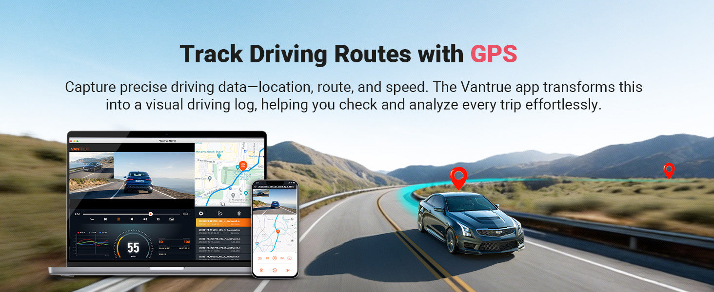 La Vantrue E2 Pro está equipada con GPS para que se pueda realizar un seguimiento de la velocidad actual, la ruta y la ubicación. Si se desea, la velocidad se puede mostrar en la parte inferior de cada vídeo y la ubicación y la ruta de la grabación se pueden ver más tarde a través de la aplicación.
